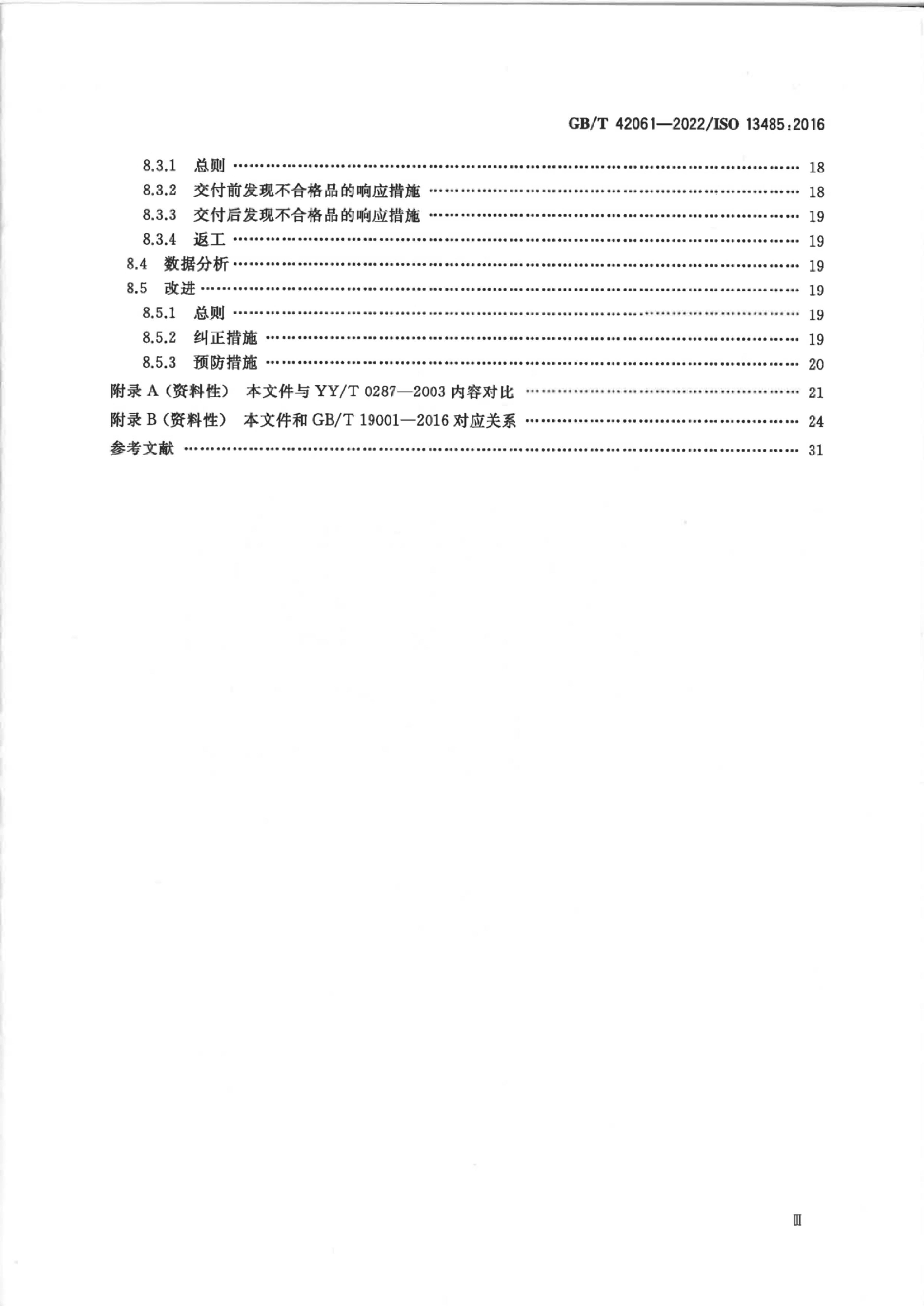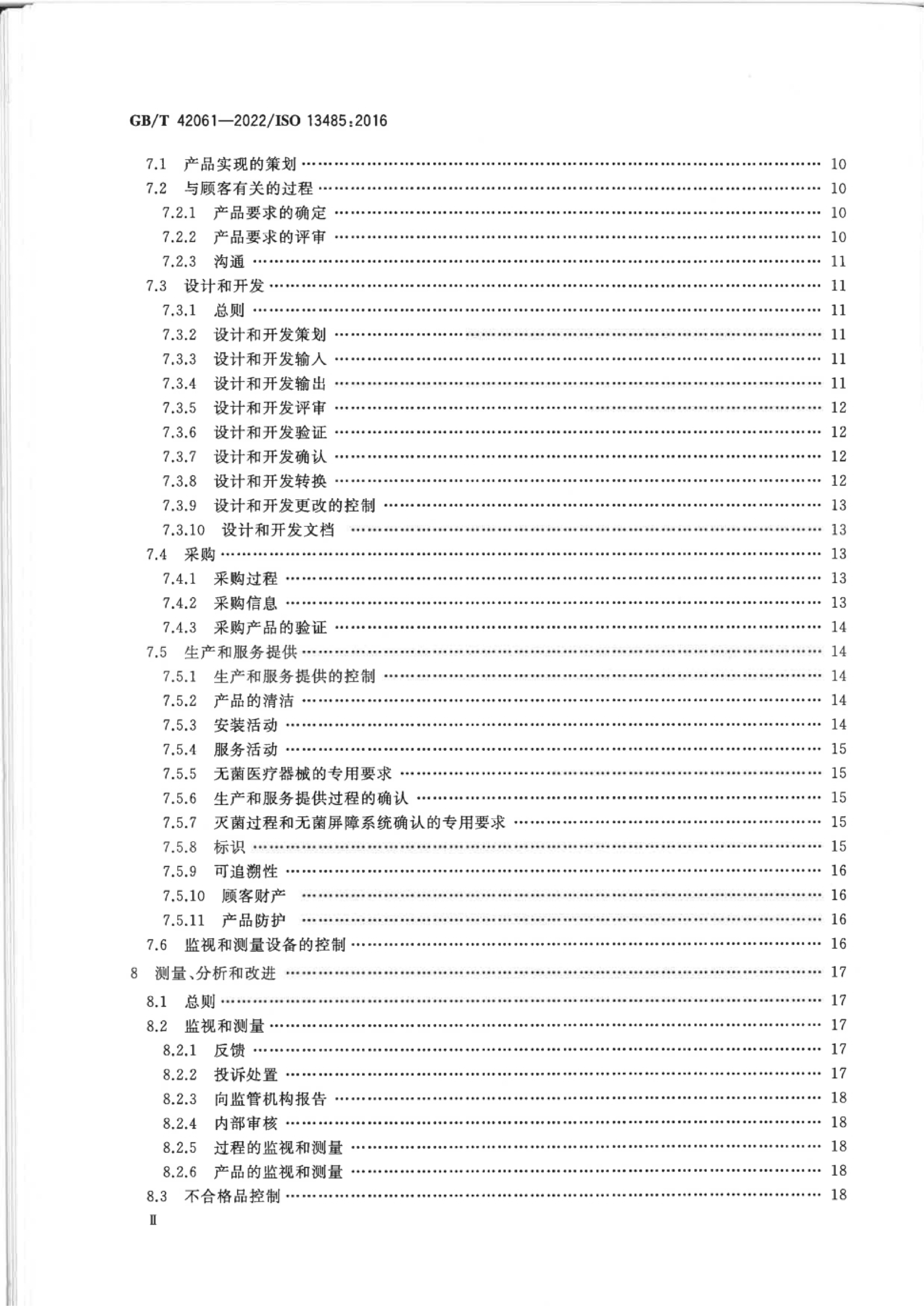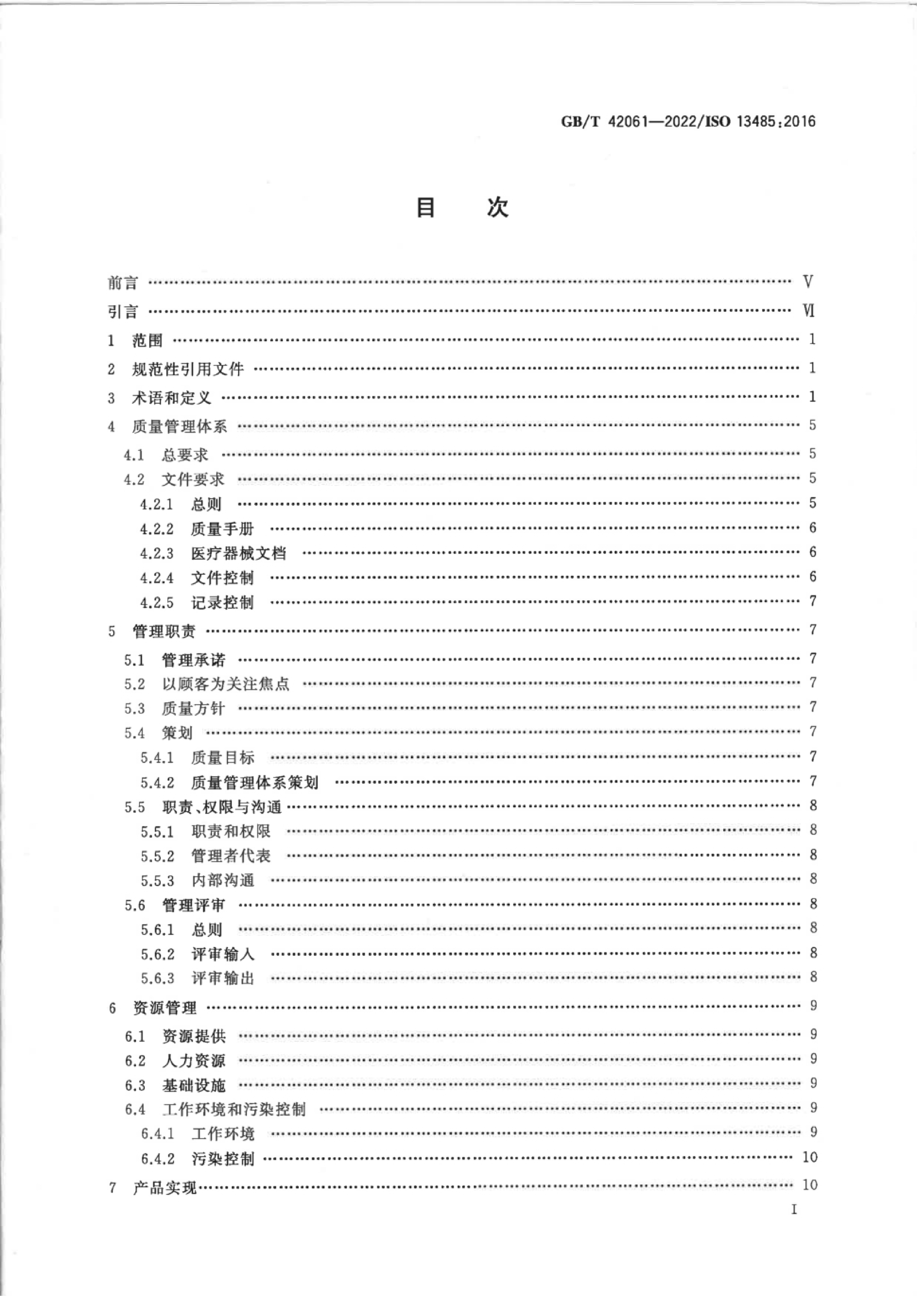 已公示GB/T 42061-2022/ISO 13485:2016《医疗器械 质量管理体系 用于法规的要求》封面及目录,若需获取全文可通过以下途径获取: