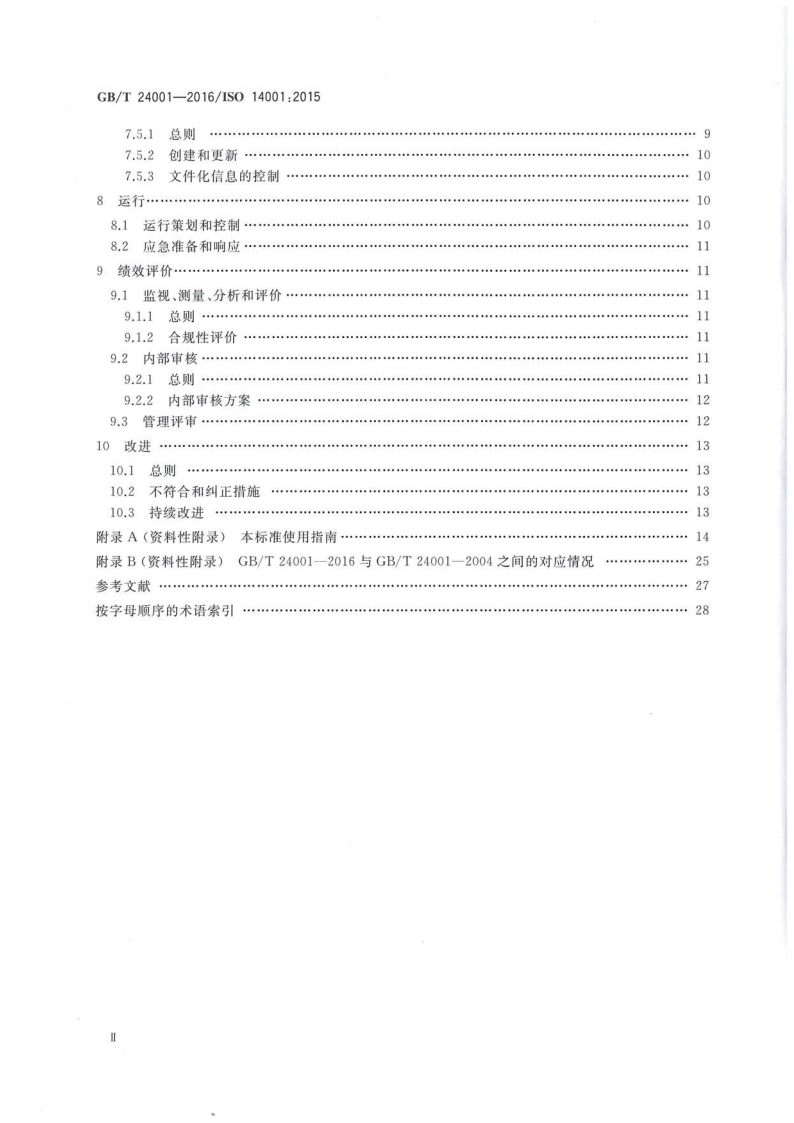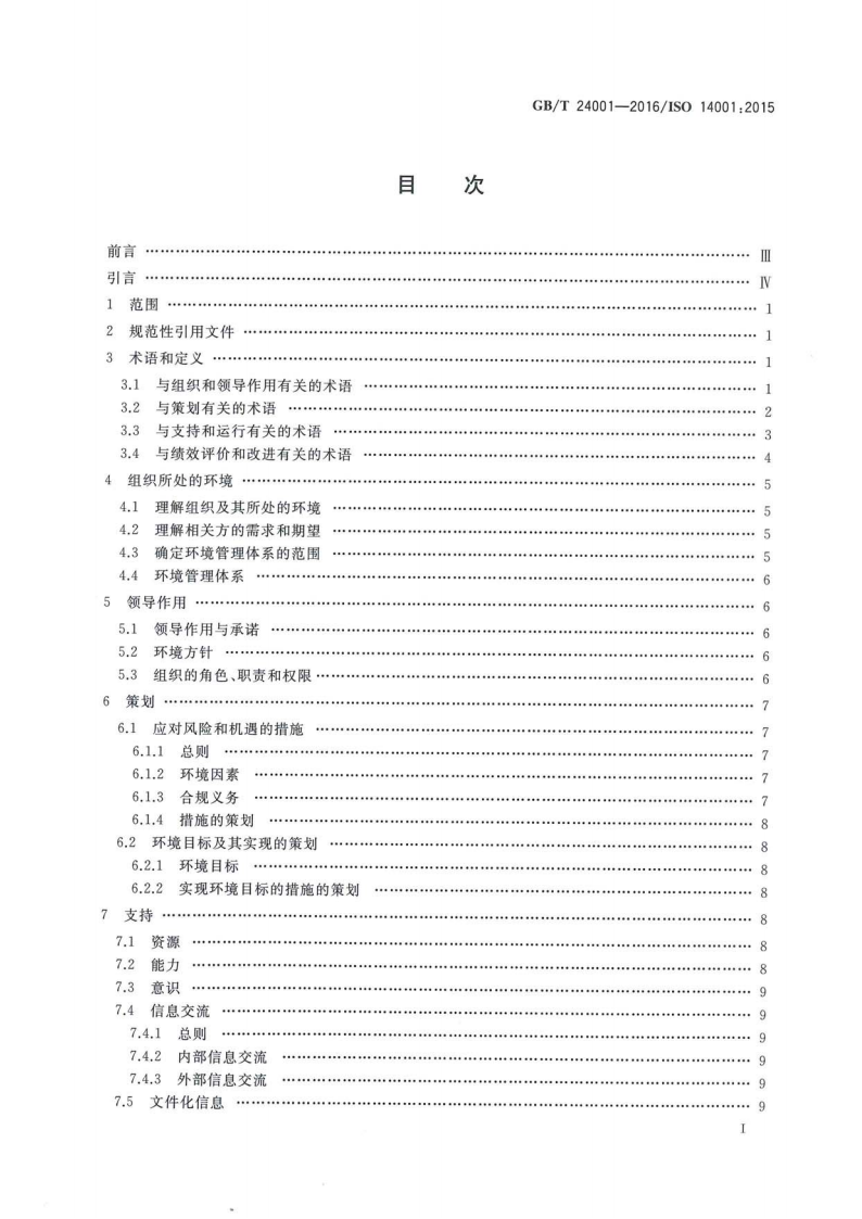 已公示GB/T 24001-2016/IS014001:2015《环境管理体系要求及使用指南》封面及目录,若需获取全文可通过以下途径获取: