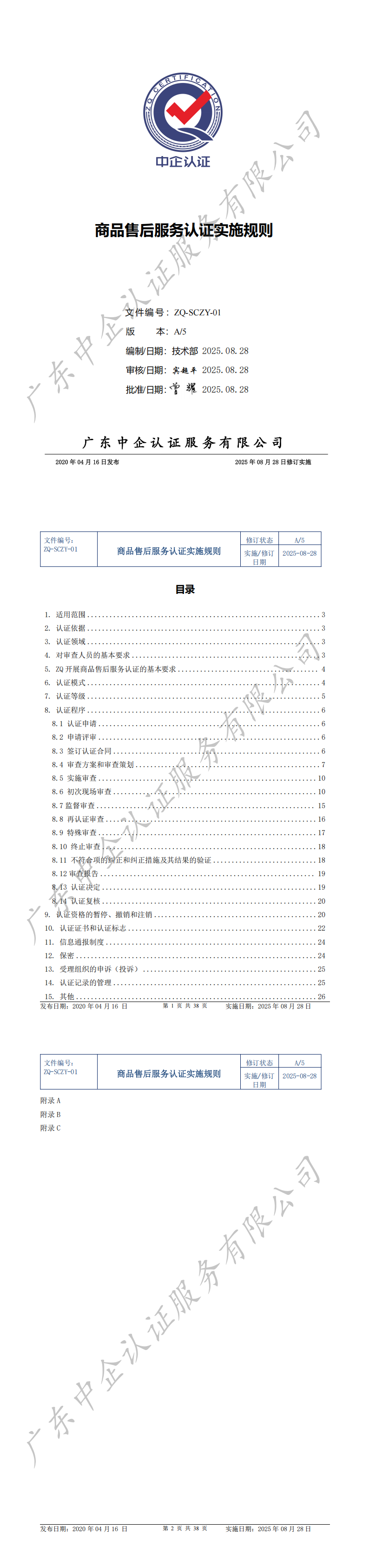 已公示商品售后服务认证实施规则封面及目录,若需获取全文可通过以下途径获取: