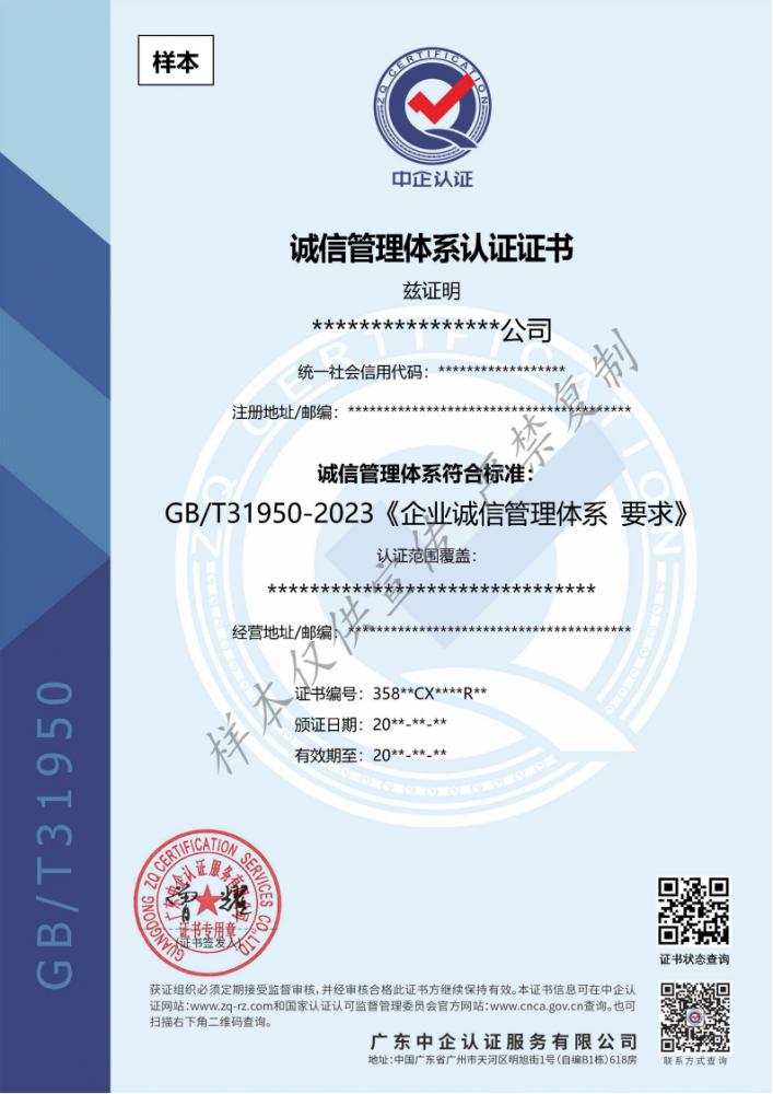 企业经认证机构审核,如果符合《GB/T 31950-2023 企业诚信管理体系 要求》国家标准,通过企业诚信管理体系认证,将颁发认证证书,证书在国家认监委网站上予以公示。企业可登录认监委网站(全称:中国国家认证认可监督管理委员会)查询。