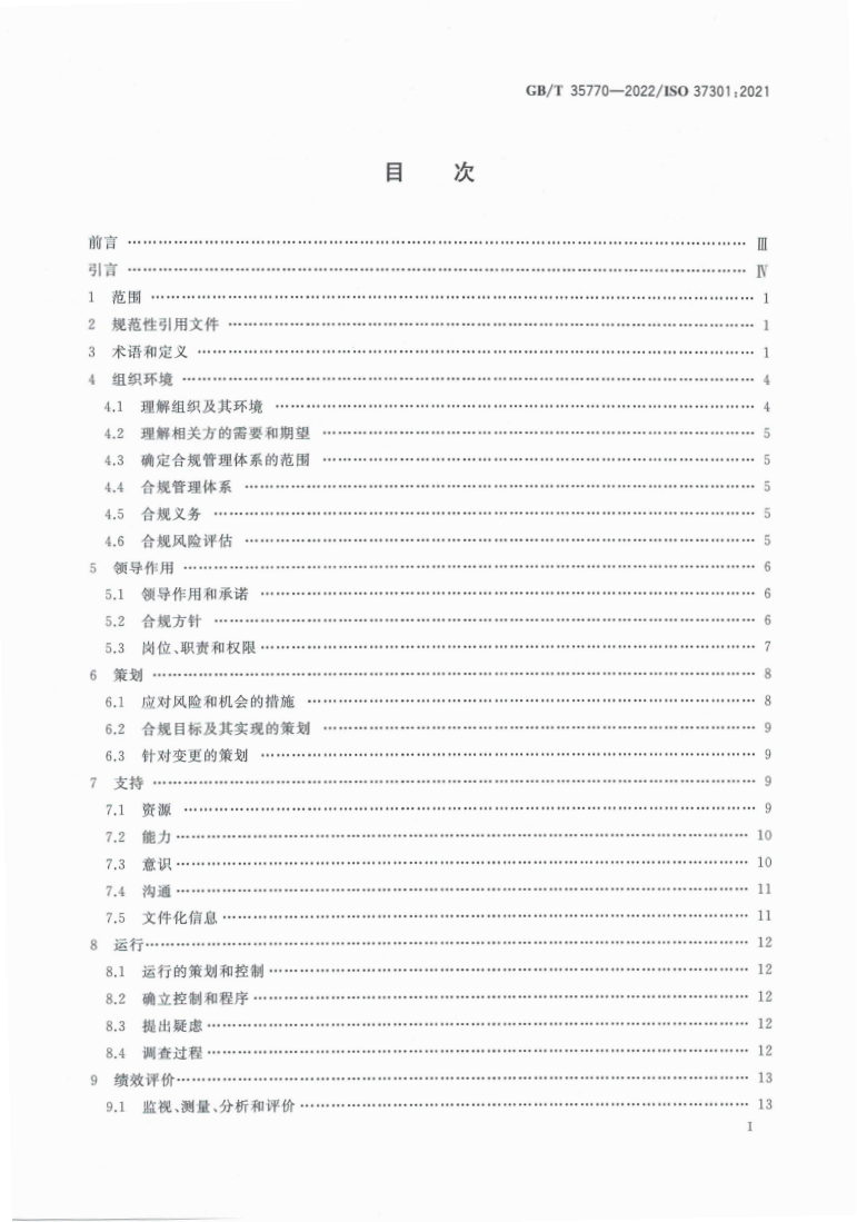 已公示GB/T 35770-2022/ISO37301:2021《合规管理体系 要求及使用指南》封面及目录,若需获取全文可通过以下途径获取: