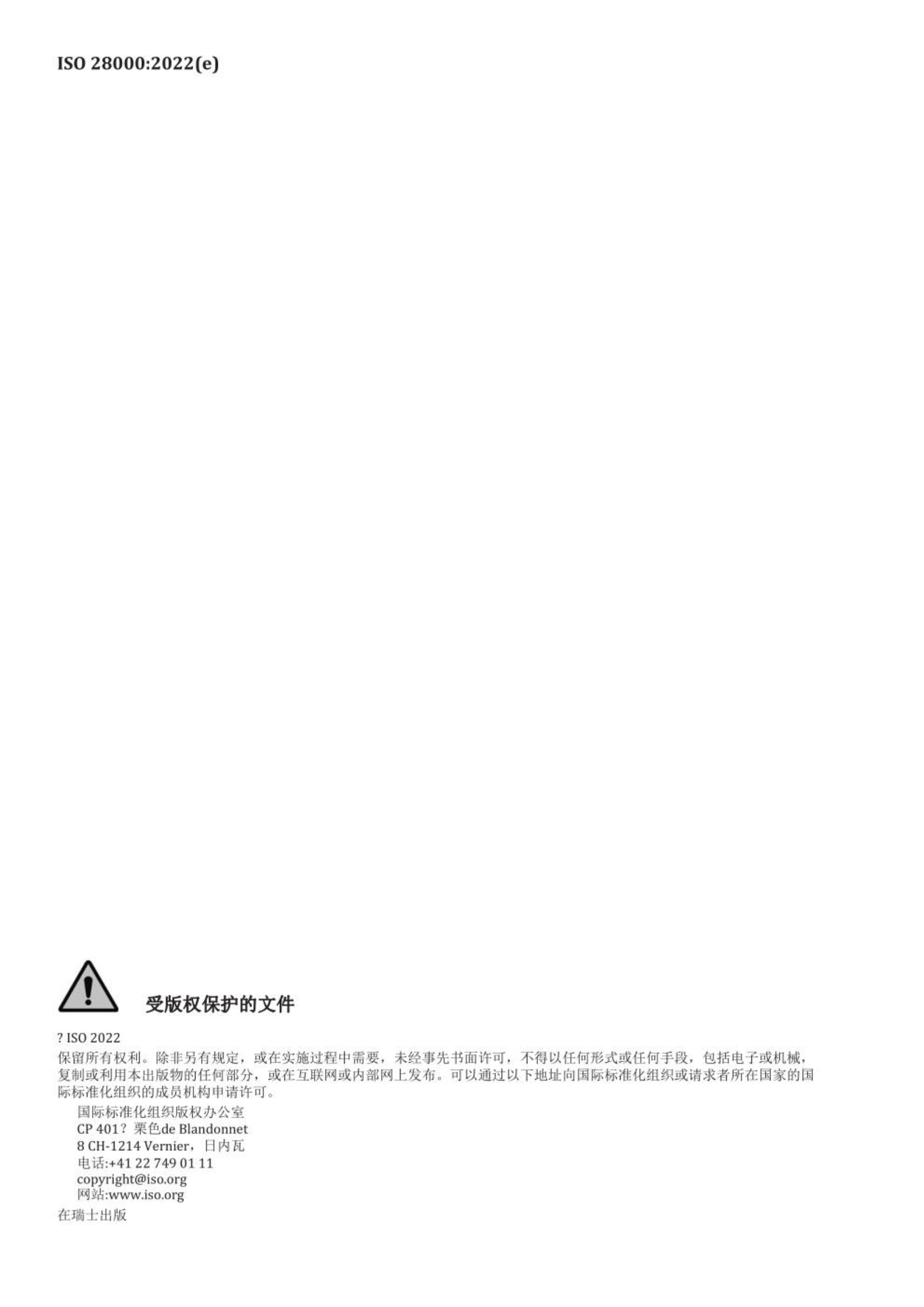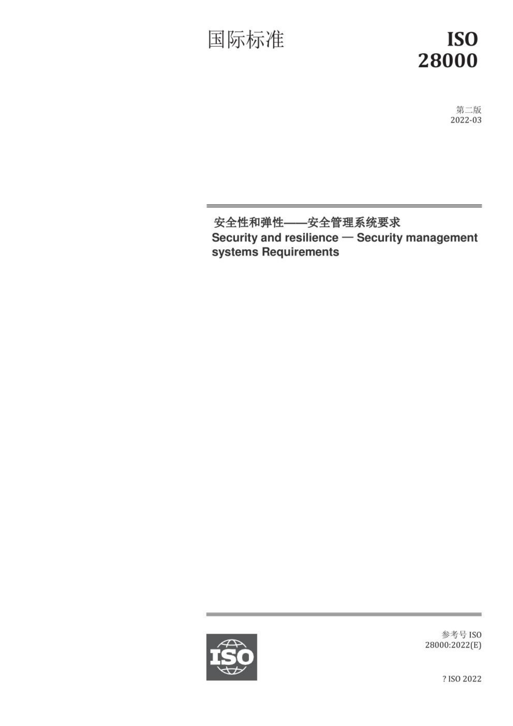 已公示ISO 28000 : 2022 《安全性和弹性 安全管理系统要求》封面及目录,若需获取全文可通过以下途径获取: