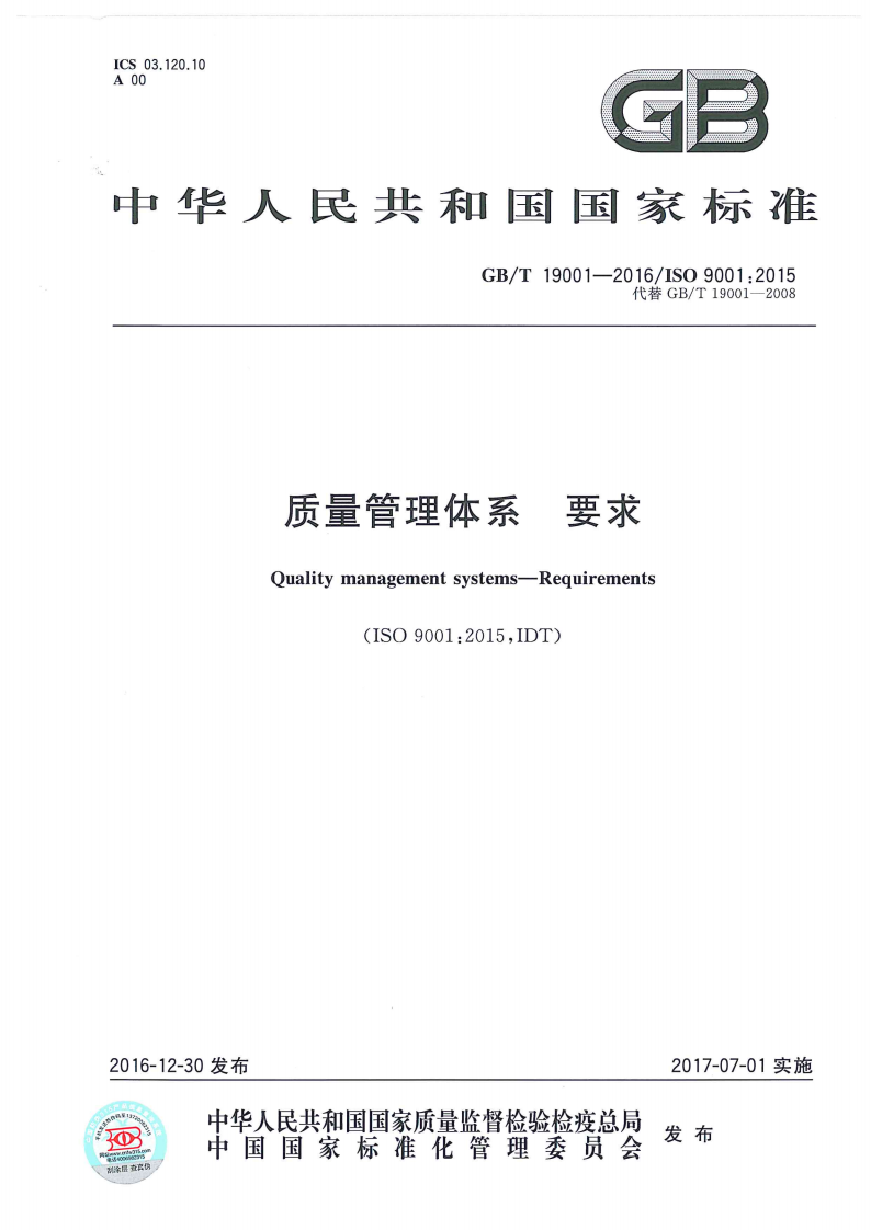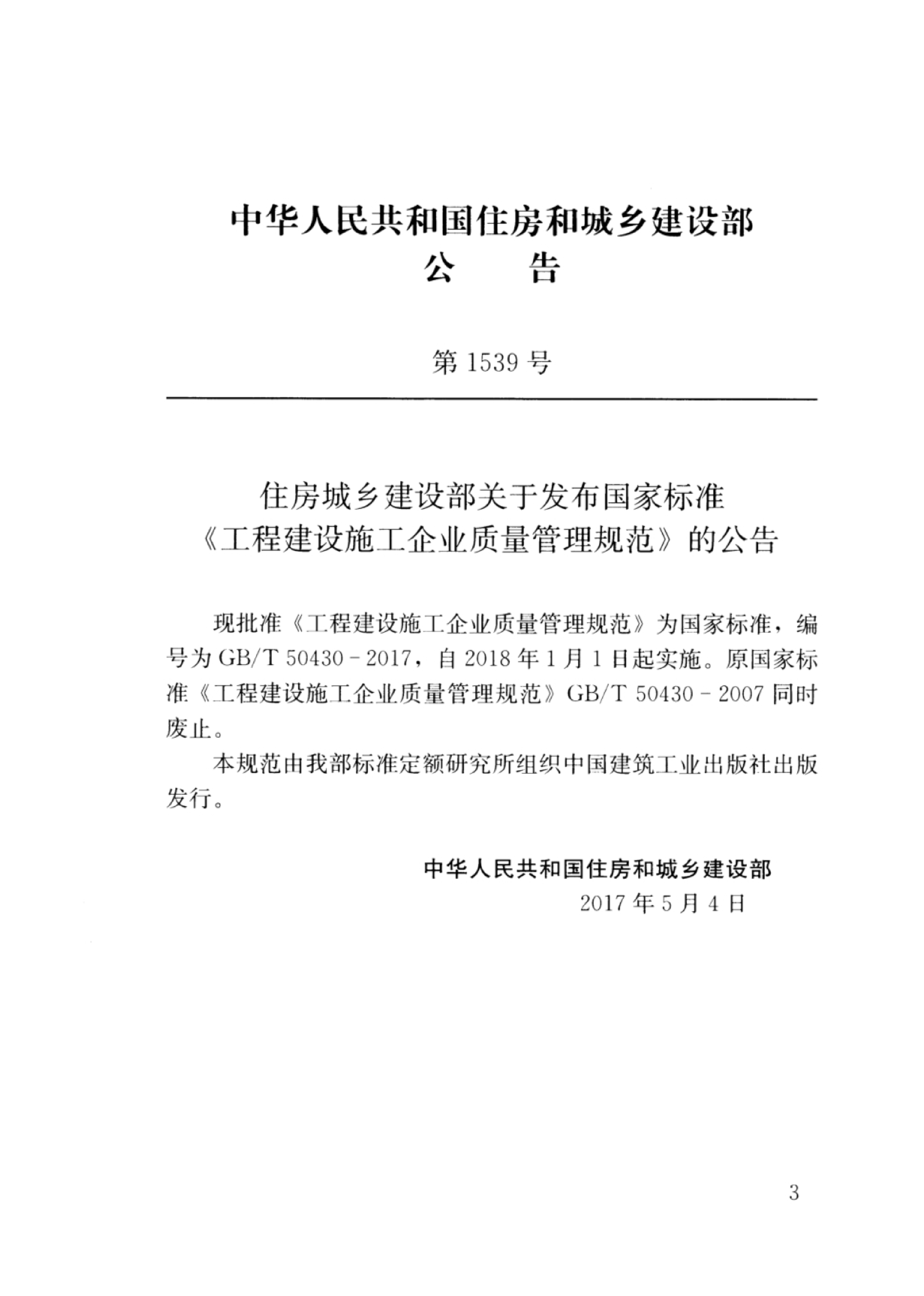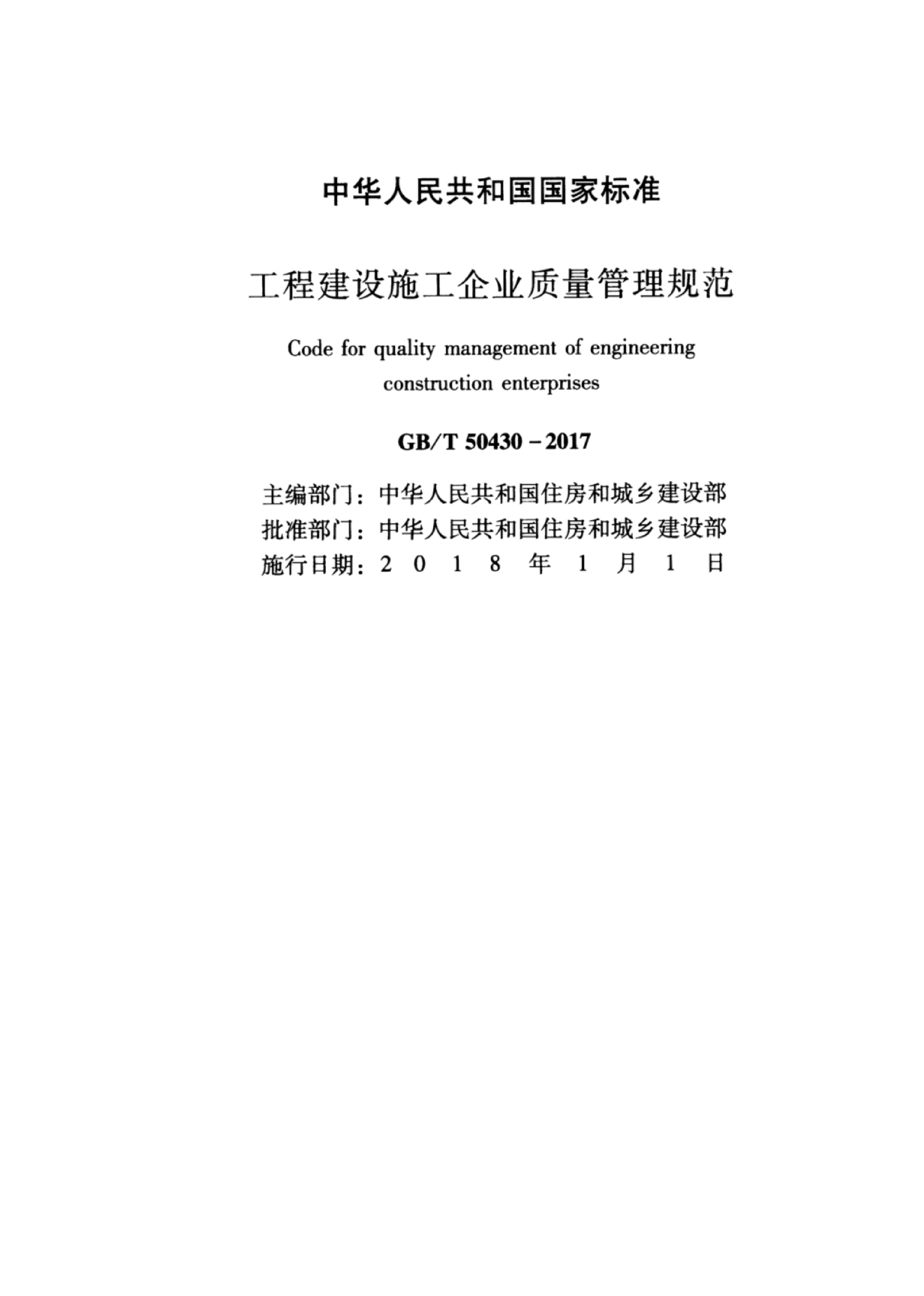 已公示GB/T 50430-2017 《工程建设施工企业质量管理规范》和GB/T 19001-2016/ISO 9001:2015《质量管理体系 要求》封面及目录,若需获取全文可通过以下途径获取: